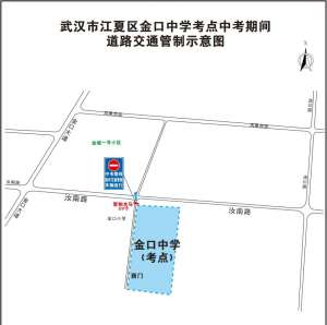 汝南路金口中学路口:考试期间禁止社会车辆通行,仅允许持有准考证的考试车辆进入考试路段,车辆到达金口中学西门30米处,考生下车后车辆即停即走,送考车辆有序调头驶离,其他社会车辆请提前绕行。